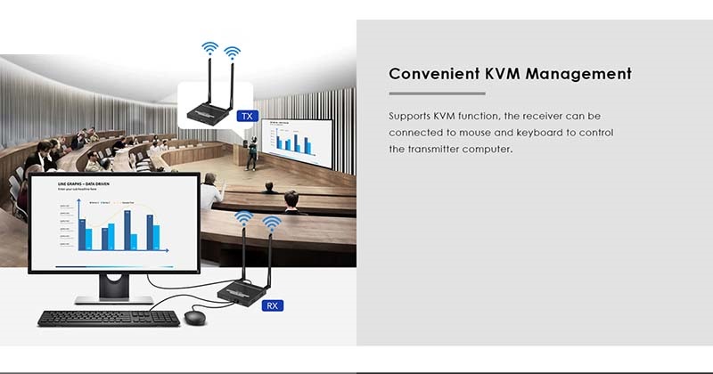 اکستندر بیسیم HDMI لنکنگ LENKENG LKV699KVM از عملکرد KVM پشتیبانی میکند در نتیجه گیرنده میتواند به ماوس و صفحه کلید برای کنترل کامپیوتر فرستنده متصل شود. با اتصال ماوس و کیبورد به گیرنده، کنترل کردن فرستنده برای شما راحتتر خواهد شد. این قابلیت تنها تفاوت LENKENG LKV699KVM با LKV699 میباشد.