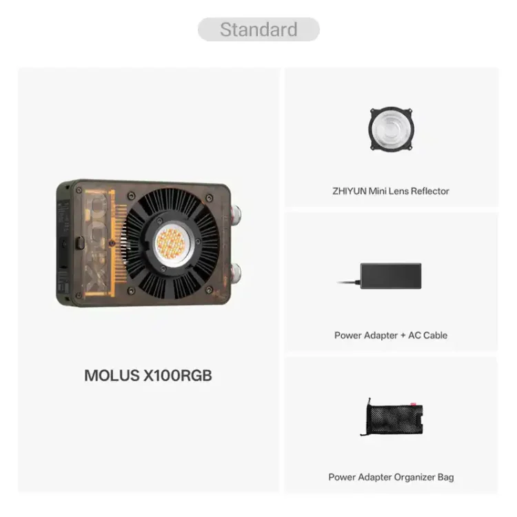 پکیج “استاندارد” شامل خود محصول، یک مینی لنز رفلکتور، آداپتور برق و کیف آداپتور